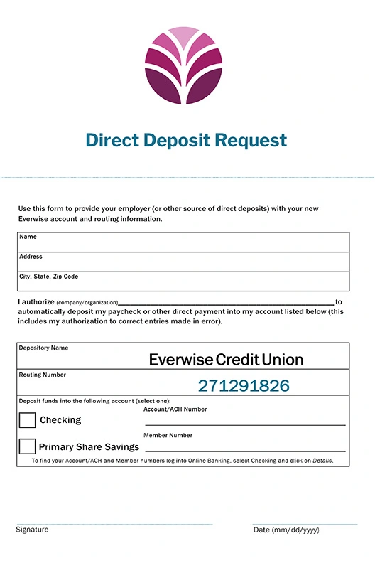 Transfer your direct deposit (payroll, Social Security, pension, investment/brokerage, etc.) by downloading the form or by contacting your employer or the business/organization initiating the deposit. Provide them your new account number and Everwise's routing and transit number (271291826).